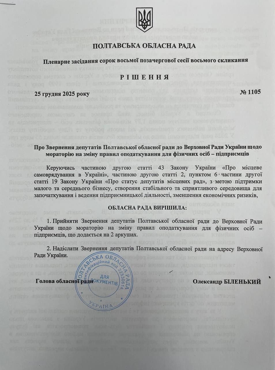 25 грудня під час сесії Полтавської обласної ради депутати підтримали мою ініціативу щодо звернення до Верховної Ради України з метою недопущення запровадження додаткового податкового навантаження на малий та середній бізнес.