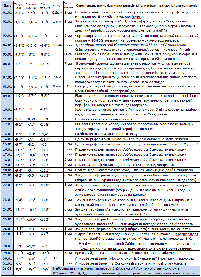 Узагальнені показники погоди на метеорологічній станції ПОЛТАВА за січень 2026 року (щоденні показники автор брав із сайту Метеопост та з метеорологічних карт). Вони не претендують на абсолютну точність, тому буду вдячний кліматологам за уточнення.