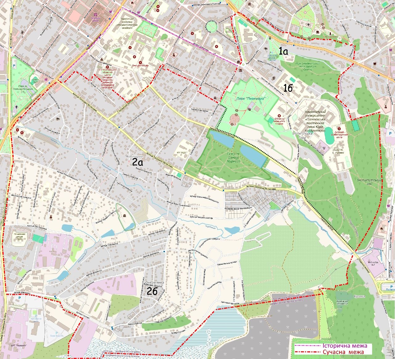Історичні Кобищани на початку ХІХ ст. починалися від вододільної лінії між Мазурівською і Кобищанською балками. Головні вулиці відповідали вододільним лініям між річковими басейнами чи великими балками; орієнтовно по цих лініях проходили торговельні й поштові шляхи, біля яких пізніше формувалася забудова (вулиці). Отже, північна межа історичних Кобищанів - вулиця Шевченка, західна - вулиця Європейська, а східна відповідає підніжжям "гір", - переходу до заплави Ворскли.