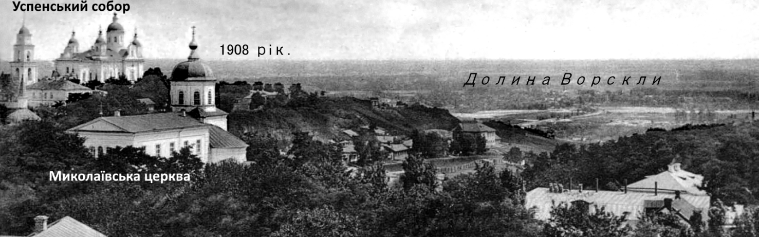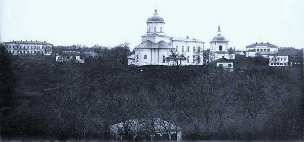 Свято-Миколаївський храм на Микільській гірці. Вигляд із південного сходу, від підніжжя гірки (у наш час тут облаштоване так зване "Джерело Марусі Чурай"). На дальньому плані видно Стрітенську церкву. Автор і час, коли виконане фото невідомі (не пізніше рубежу 1920-х / 1930-х років).