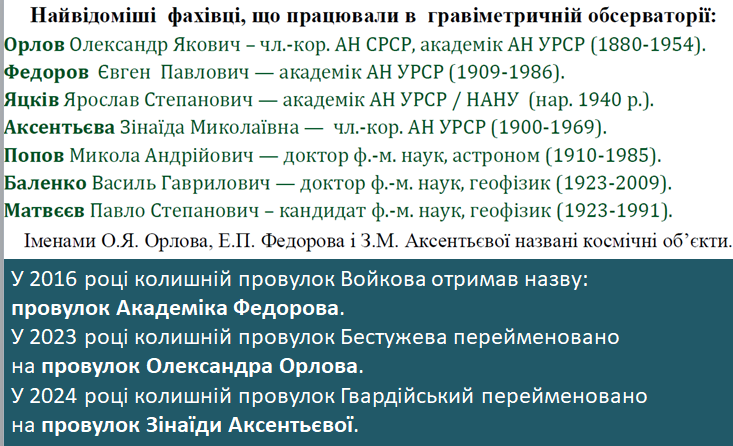 У 1951 році О.Я. Орлов залишив Полтаву і переїхав до Київа, де в Голосієво організував астрономічну обсерваторію АН УРСР і став її директором. У Полтаві директоркою обсерваторії залишилась його гідна спадкоємниця Зінаїда Миколаївна Аксентьєва (1900-1969), член кореспондент АН УРСР з 1951. В обсерваторії вона працювала з 1926 по 1934 та з 1939 по 1969 роки. Від 1951 року до кінця життя – її директорка. У 1941 році керувала організацією евакуації обсерваторії до Іркутська де обсерваторія працювала до 1944 року. Планувала перетворення Полтавської гравіметричної обсерваторії на Інститут астрономії, геодезії і геофізики АН УРСР. Коли вона була директоркою обсерваторія досягла свого найбільшого розвитку. В той час значно розширились програми і тематика наукових досліджень. Від липня 2024 р. провулок на Павленках у Полтаві носить ім’я Зінаїди Аксентьєвої.