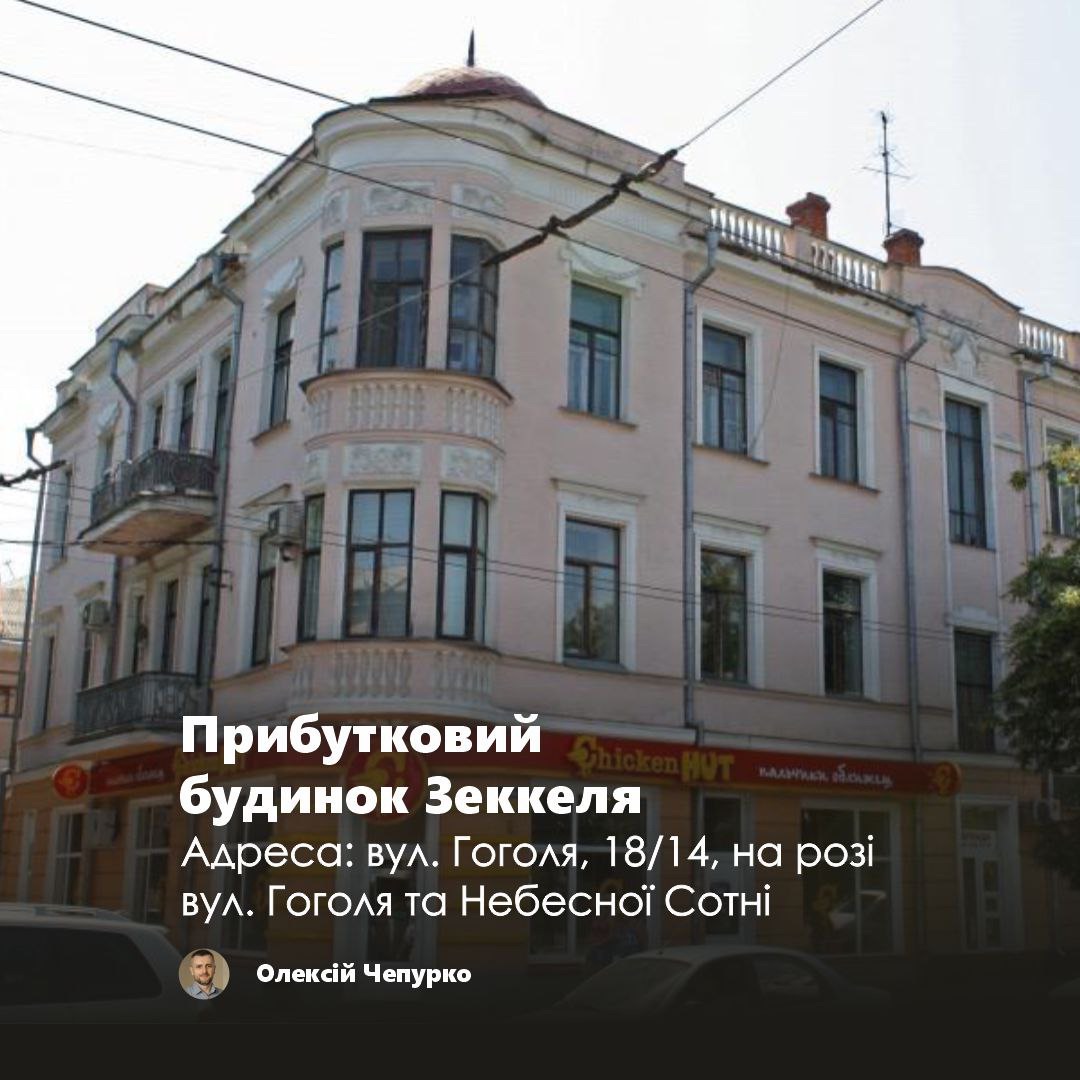 Збудований у 1906 році на замовлення торговця Зеккеля (архітектор В. Весселі). На першому поверсі працював галантерейний магазин, квартири вище здавалися в оренду. Сьогодні це одна з перлин старої Полтави.