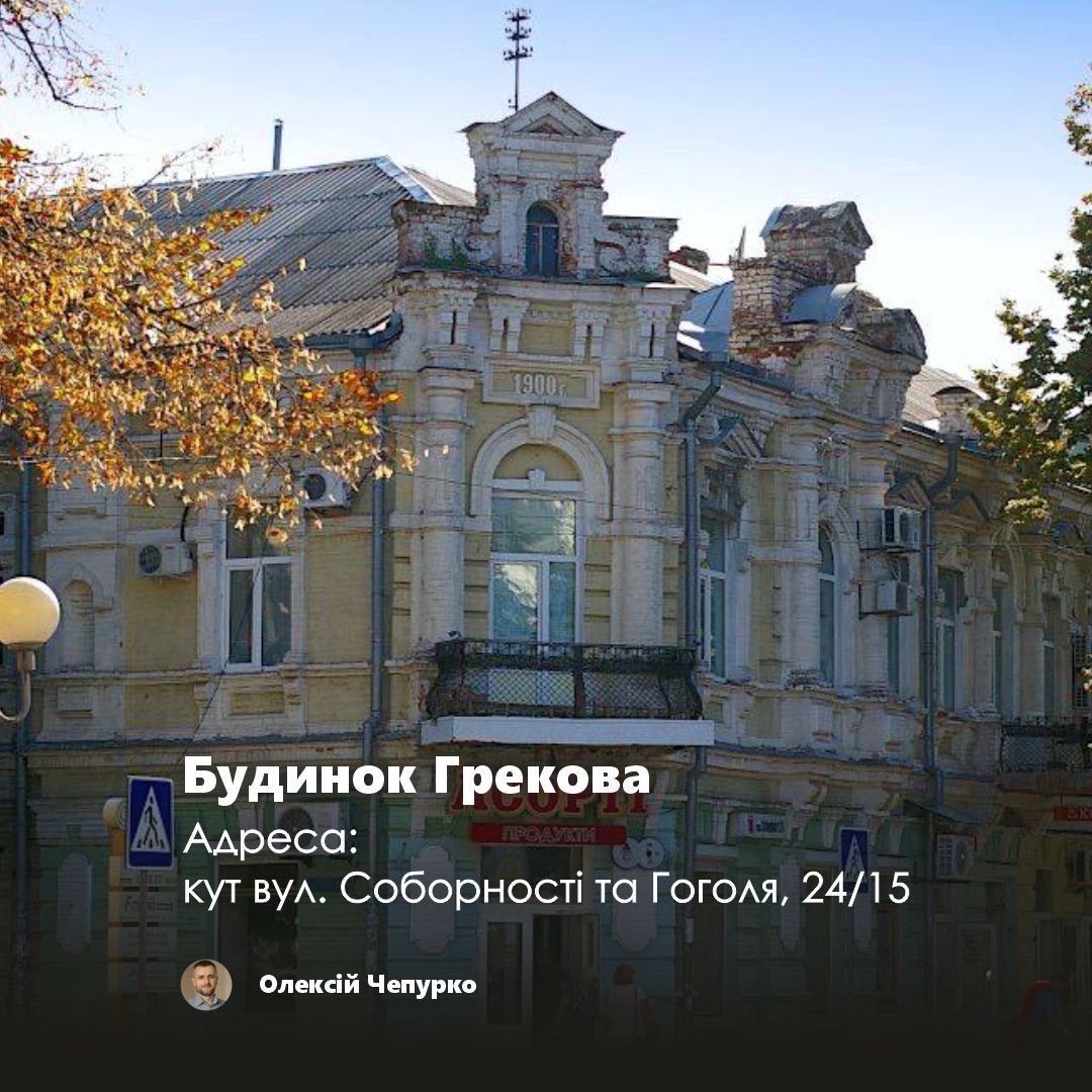Підприємець Федір Греков звів його у 1900 році. Спершу тут діяло акцизне управління, потім — Товариство Червоного Хреста. Після війни будинок відновили: на першому поверсі відкрили магазини, на другому оселилися мешканці.