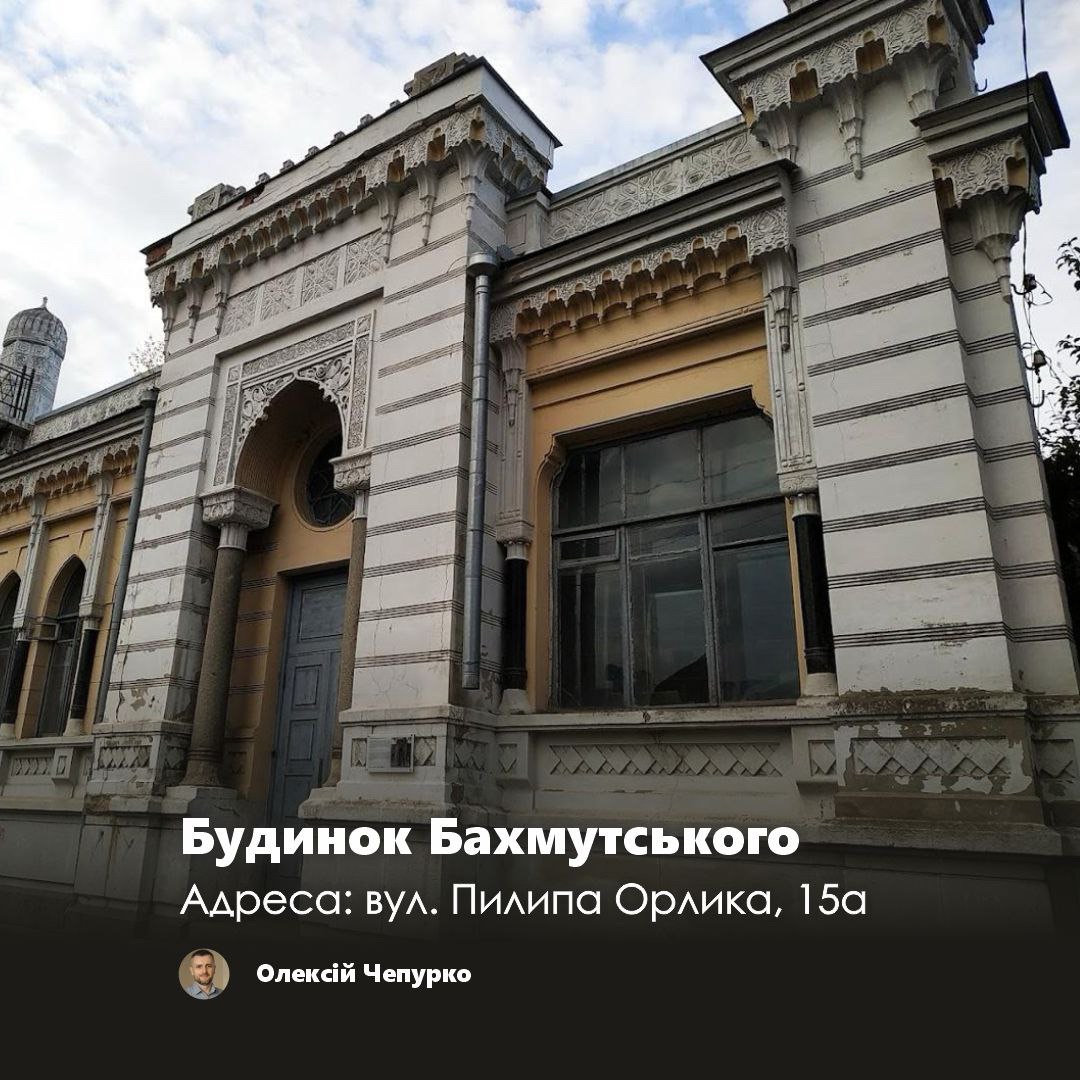 Зведений у 1906 році підрядником Наумом Бахмутським як подарунок своїй коханій. Мавританські арки, візерунки, східні мотиви — усе нетипове для Полтави. Є версія, що архітектором був Владислав Городецький, творець київського Будинку з химерами. Після революції тут були майстерня, церква, штаб нацистів і комунальні квартири.