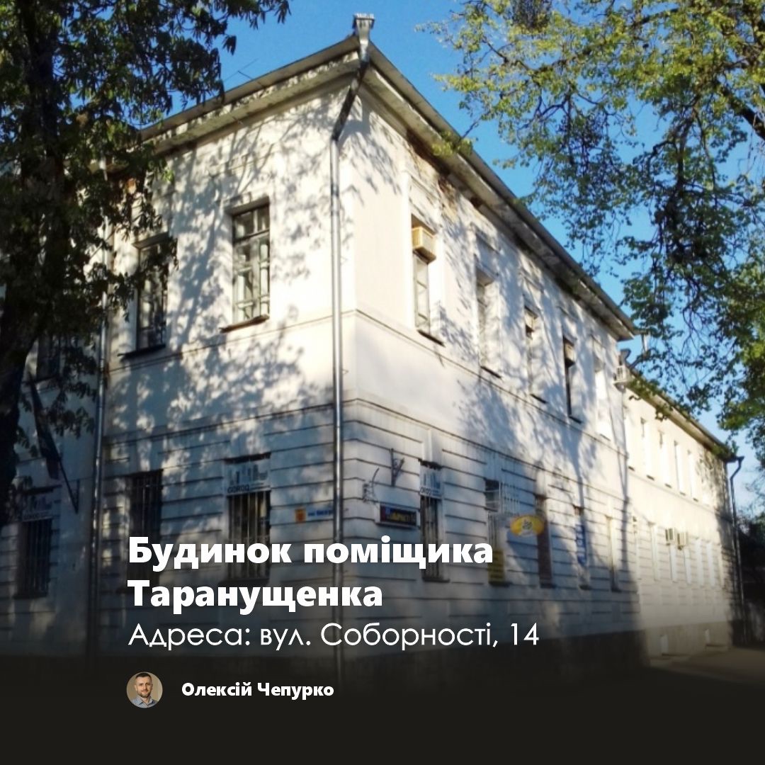 Збудований у 1838 році, спершу належав дружині міського голови Полтави — пані Беляєвій. Та після кримінальної справи проти Семена Беляєва за хабарництво та розтрату, майно родини, зокрема і цей будинок, було виставлено на продаж. Його придбав купець Іосиф Ейзлер, який згодом продав власнику цегельного заводу Володимиру Таранущенку — почесному громадянину Полтави та церковному старості Свято-Успенського собору. Нині частину будівлі переобладнано під офіс, а в іншій досі мешкають люди.