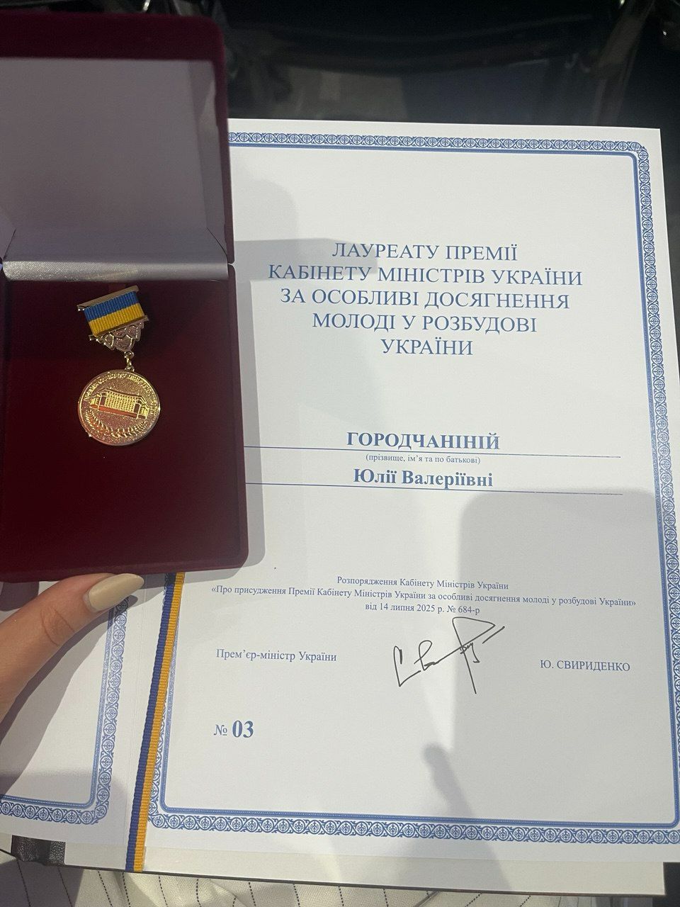 Юлія Городчаніна отримала почесну відзнаку — стала лауреаткою Премії Кабінету Міністрів України