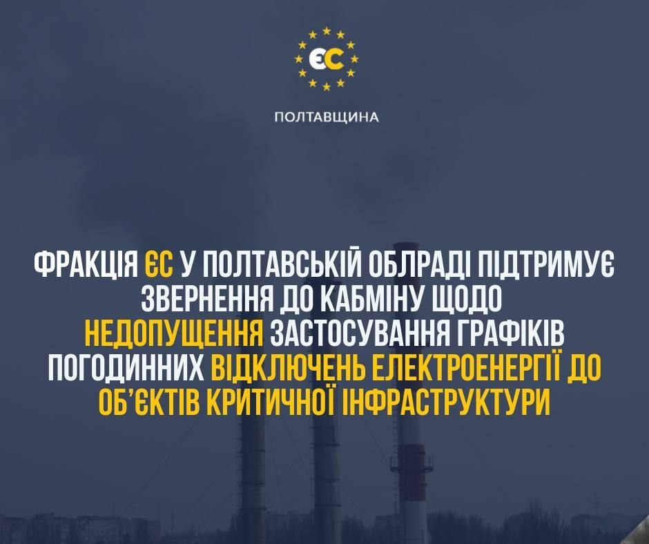 Закликаємо Кабінет Міністрів України невідкладно переглянути підходи та не допустити застосування графіків погодинних відключень електроенергії до об’єктів критичної інфраструктури Полтавської області.