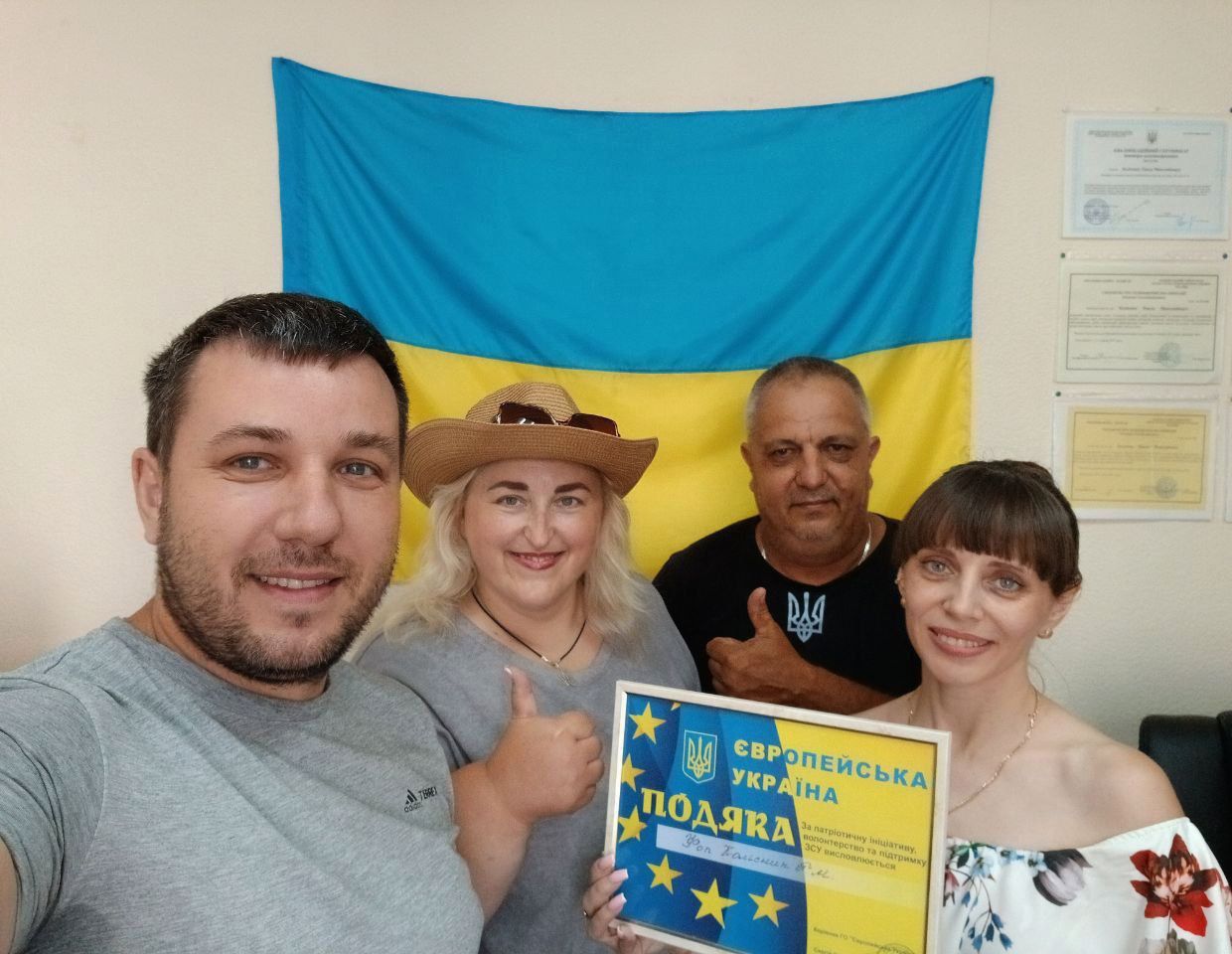 Керівник ГО "Європейська Україна", волонтер, активіст, демобілізований військовослужбовець Сергій Глоба разом з керівницею жіночого руху ГО "Європейська Україна", волонтером Оленою Ступенко подякували колективу ФОП Колісник П. М. за співпрацю в підтримці воїнів 28 ОМБр ім. Лицарів Зимового Походу та 118 окремої механізованої бригади, які тримають найгарячіші лінії фронту.
