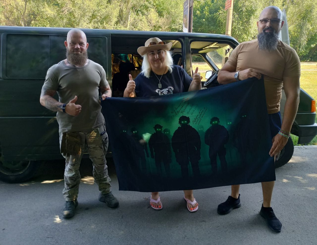 Під час недавньої поїздки на фронт до воїнів Полтавської 118 окремої механізованої бригади, що тримають найгарячіші лінії фронту на Запорізькому напрямку, від імені всіх волонтерів ГО "Європейська Україна", керівник жіночого руху зробила своїм улюбленцям - розвідці, подарунок - прапор для їх підрозділу.