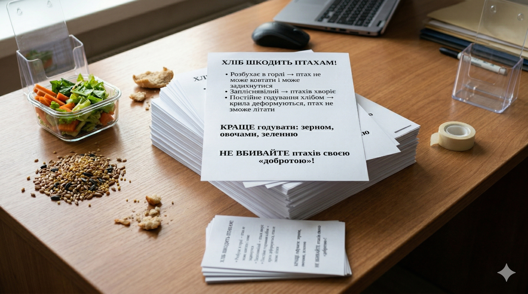 Ми плануємо розклеїти ці листівки у місцях, де люди найчастіше підгодовують птахів. Якщо побачите таку листівку — не ігноруйте її самі та поясніть іншим.