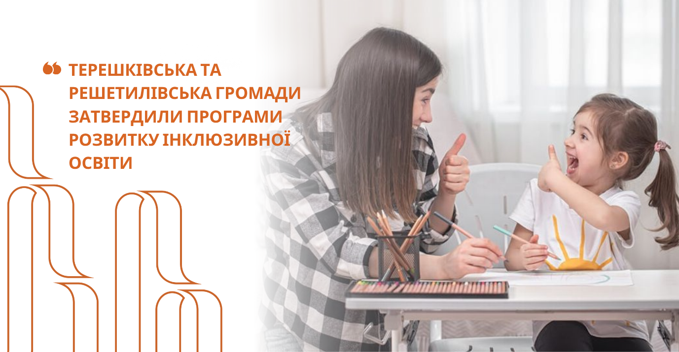 Терешківська та Решетилівська громади Полтавщини затвердили Програми розвитку інклюзивної освіти на виконання Національної стратегії. Ці документи мають забезпечити рівні можливості для дітей з особливими освітніми потребами (ООП), підтримати їхні родини та педагогів, а також створити безбар’єрне середовище в школах і дитсадках.