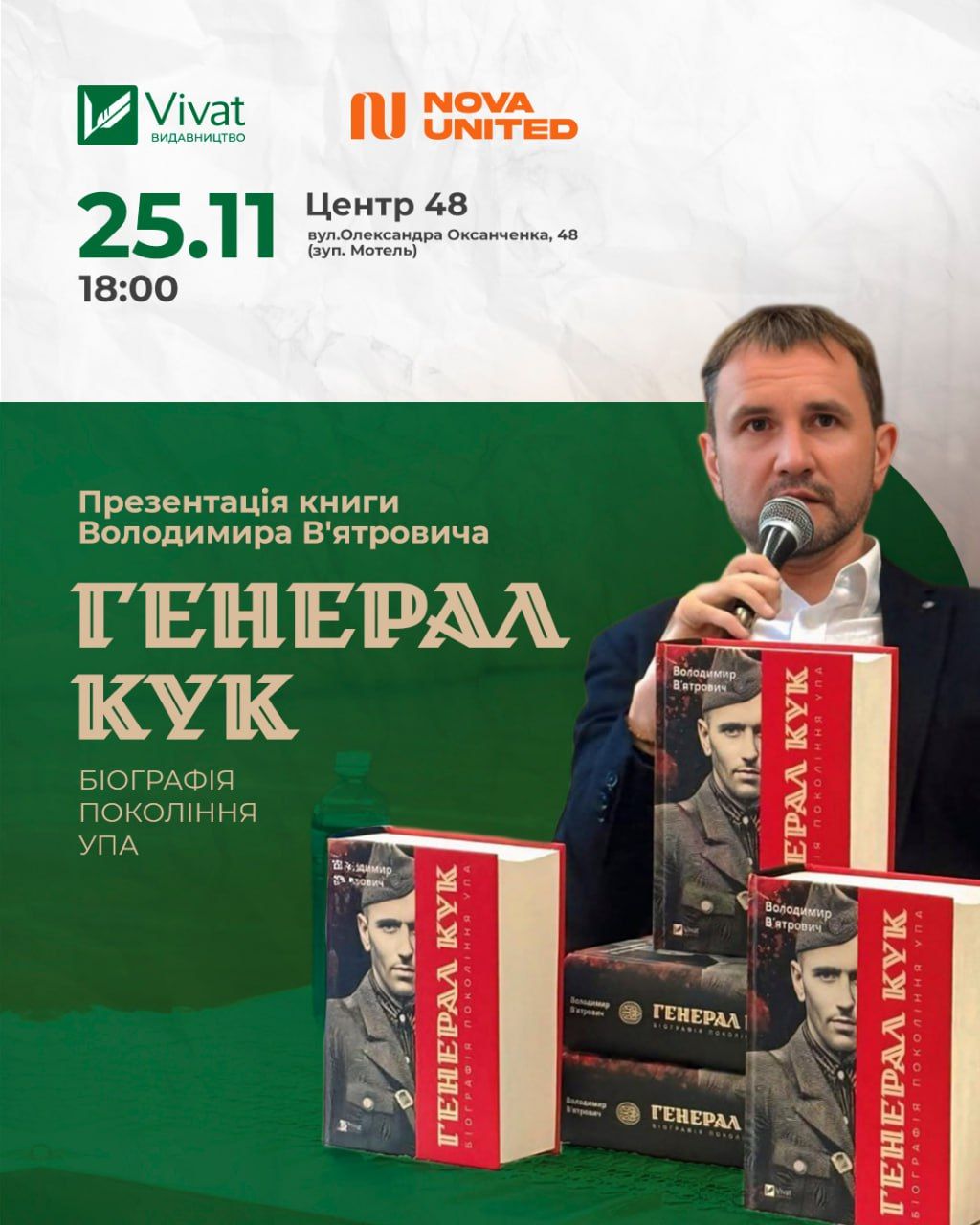 Кличемо на пізнавальну ціннісну зустріч з Volodymyr Viatrovych у Полтаві 25 листопада, о 18:00 год. з презентацією книги «Генерал Кук. Біографія покоління УПА».