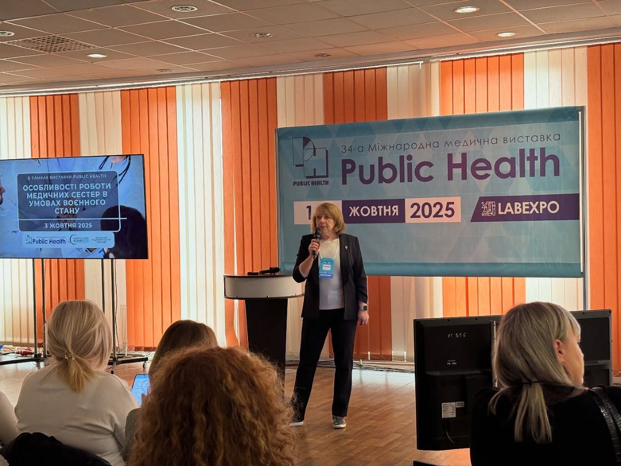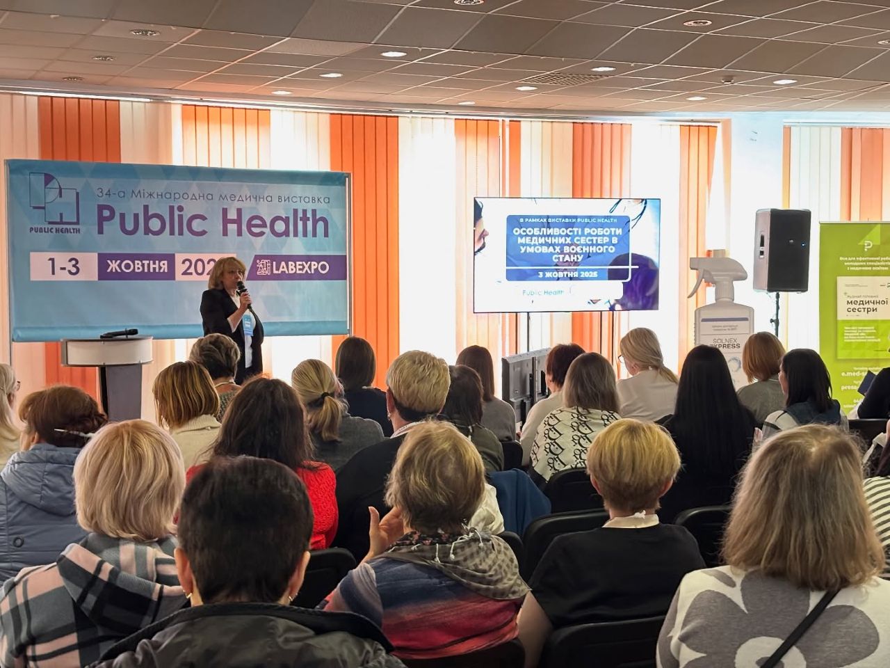 3 жовтня заступниця головного лікаря з медсестринства Ольга СИДОРЕНКО та головна медична сестра Віра РУМЯНЦЕВА взяли участь у масштабному навчально-практичному заході «Особливості роботи медичних сестер в умовах воєнного стану», що проходила в межах міжнародної виставки Public Health 2025 у Києві.