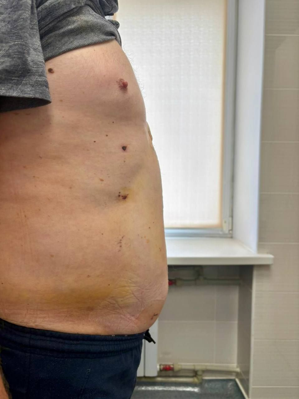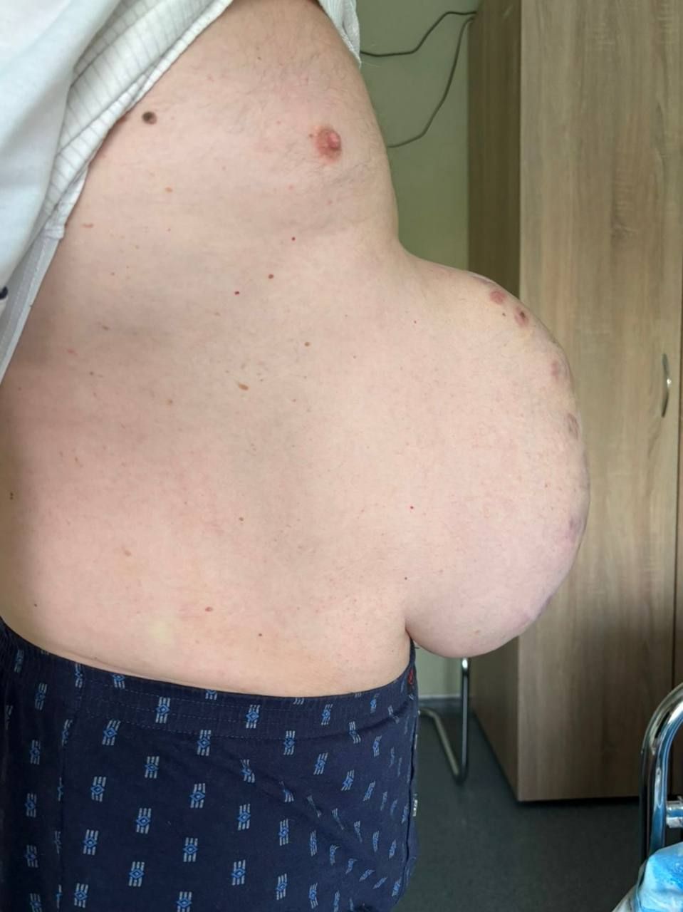 Після першої операції з приводу панкреонекрозу минув рік і у пацієнта сформувалася велика післяопераційна грижа – дефект передньої черевної стінки мав розміри 30 см у довжину та 20 см у ширину. Такі пацієнти потребують ретельної підготовки перед операцією.