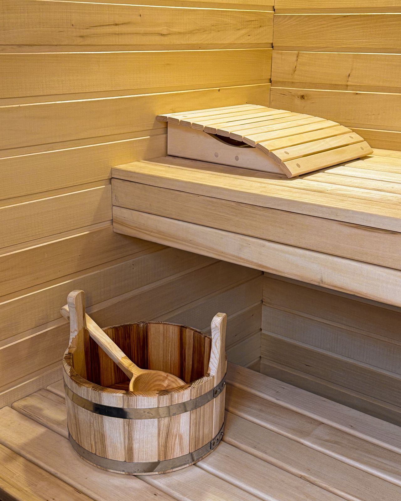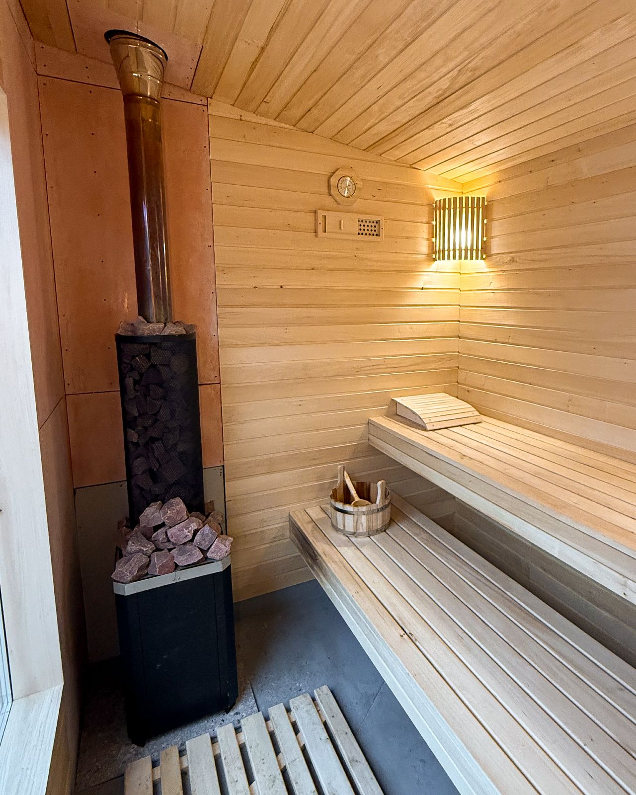 Інтер’єр лазні виконаний у природному стилі. Усередині — затишний передбанник для відпочинку, простора парна, розрахована на 3–4 особи, дров’яна піч-кам’янка, шайка та черпак для води, а також термометр і пісочний годинник, щоб ви могли насолоджуватися процесом без поспіху.