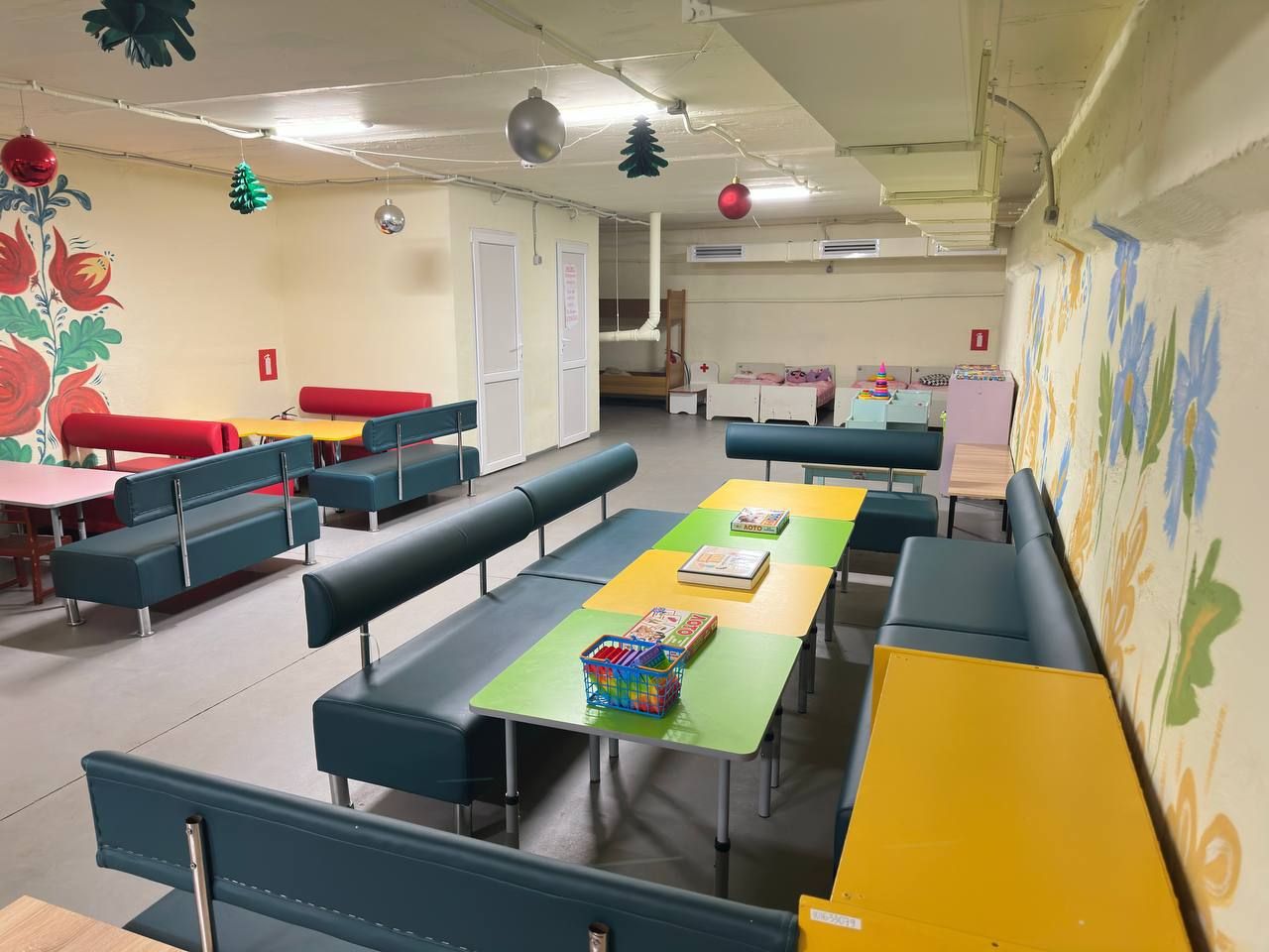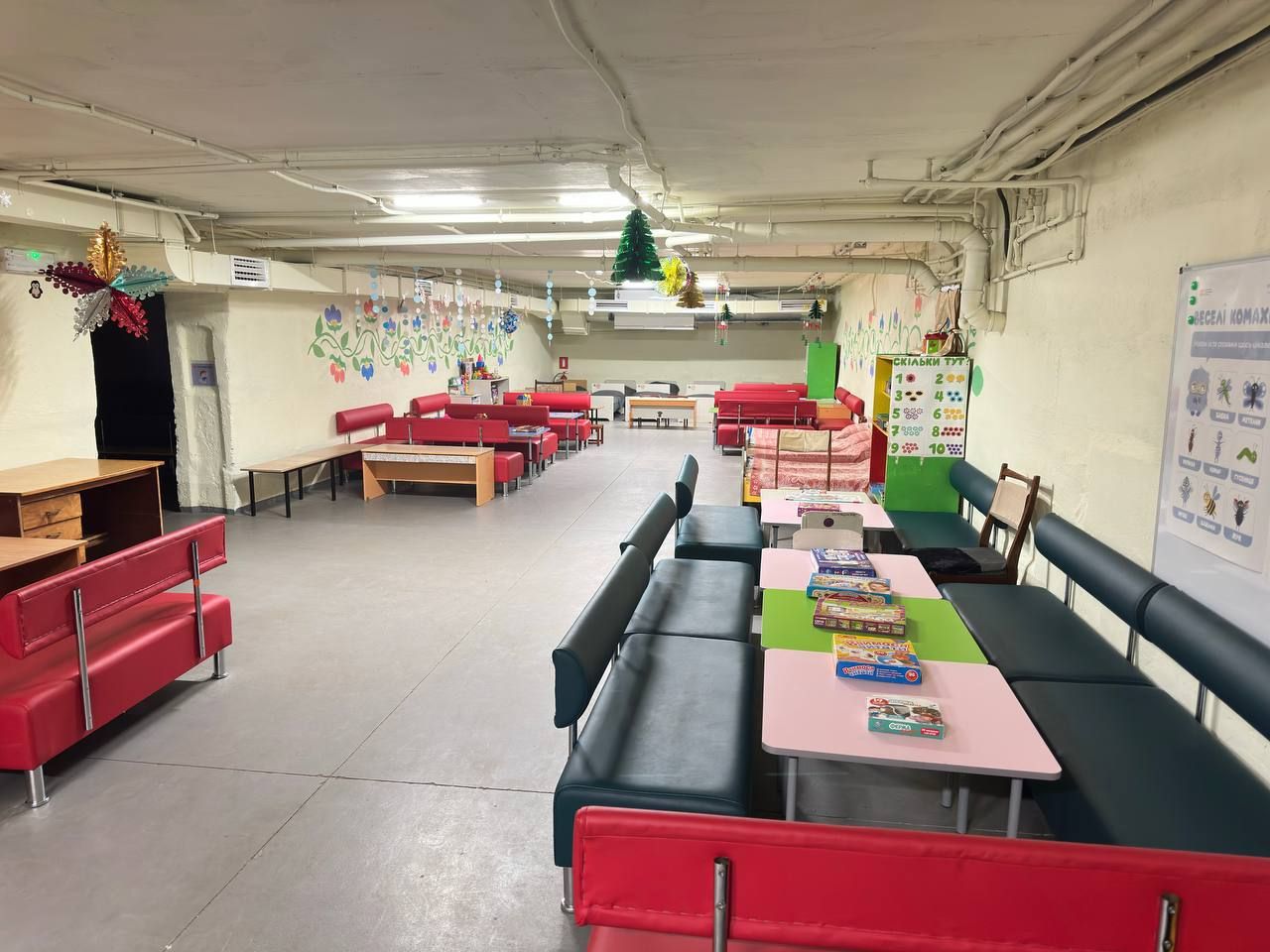 Укриття стандартне. Є світло, вода, аптечка, приміщення тепле. Простір поділений між групами — загалом базові умови забезпечені.