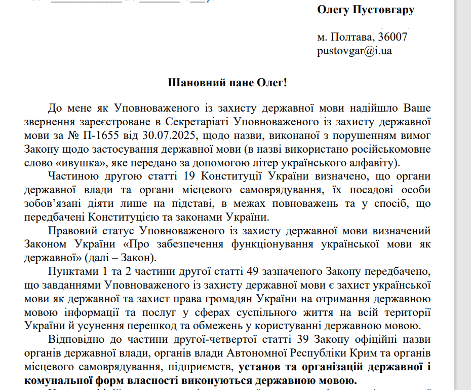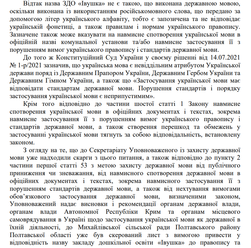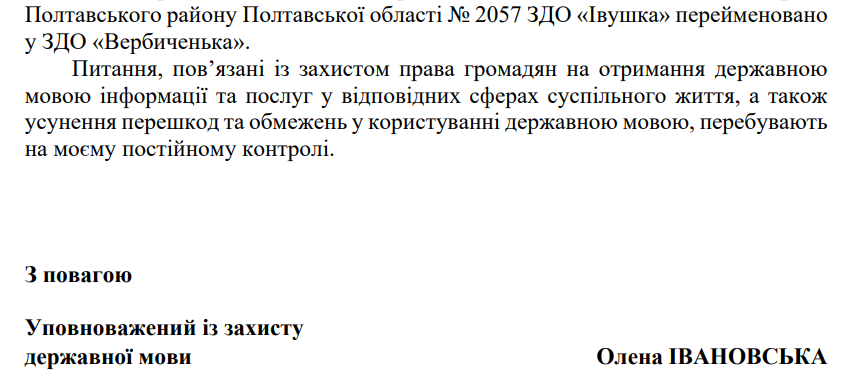 Після звернень Уповноваженої із захисту державної мови Олени Івановської та мого як представника Українського інституту національної пам’яті в Полтавській області у Михайлівській громаді Полтавського району назву місцевого комунального дитсадка привели у відповідність до норм Закону «Про забезпечення функціонування української мови як державної».