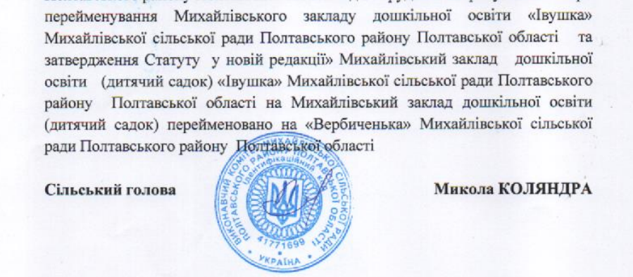 Подіяло. Михайлівський заклад дошкільної освіти (дитячий садок) «Івушка» Михайлівської сільської ради Полтавського району Полтавської області логічно перейменували на «Вербиченька».