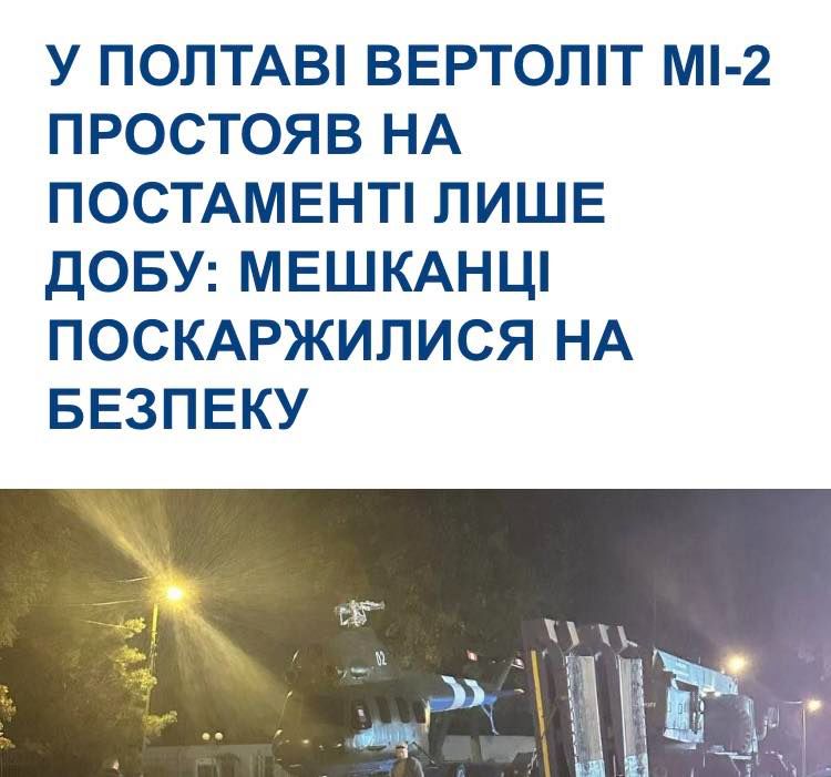 Трішки екскурсу: в Полтаві встановили муляж гелікоптера до 10-ої річниці бригади імені Сікорського. Тимчасова інсталяція мала постояти два тижні, але вже під вечір її прибрали. Нібито з такої причини як на скріні.