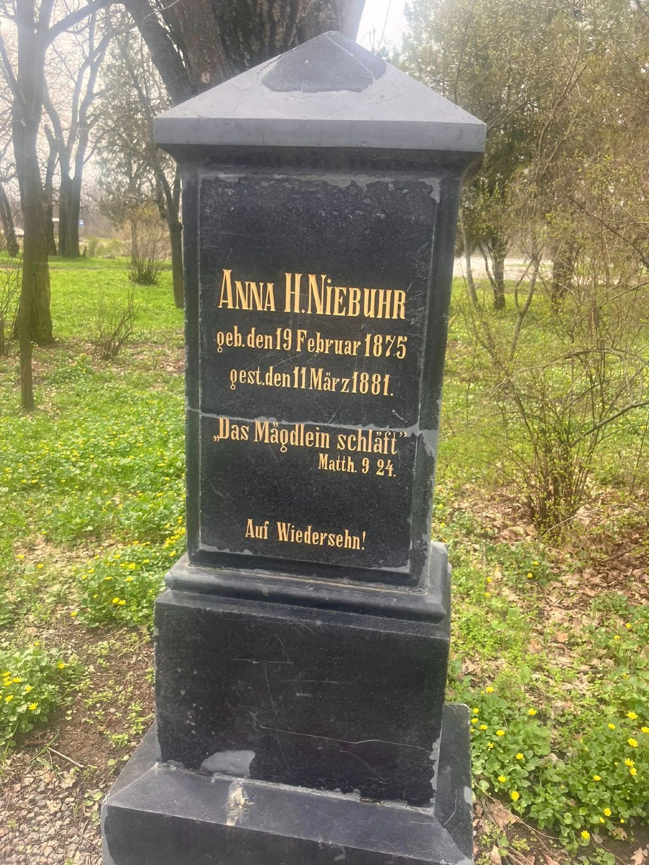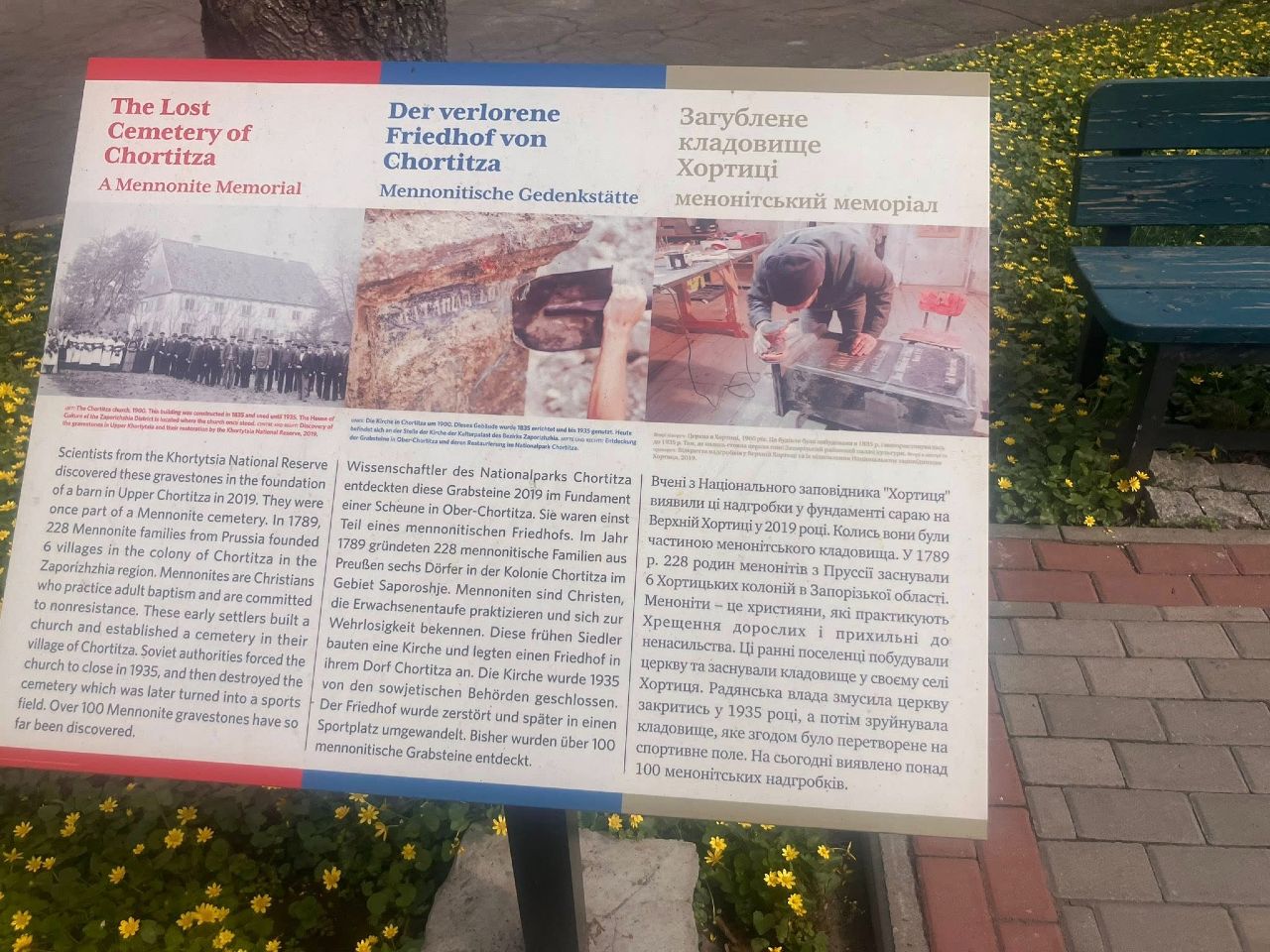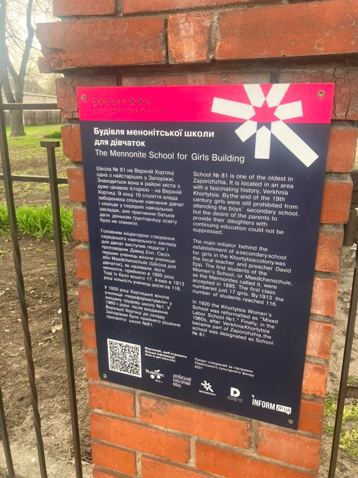 На фото приклад архітектури часів менонітів та її маркування, відновлення кладовища й один з кенотафів («Дівчинка просто заснула. До побачення» напис на плиті), й меморіал жертвам (прикритий на час війни).