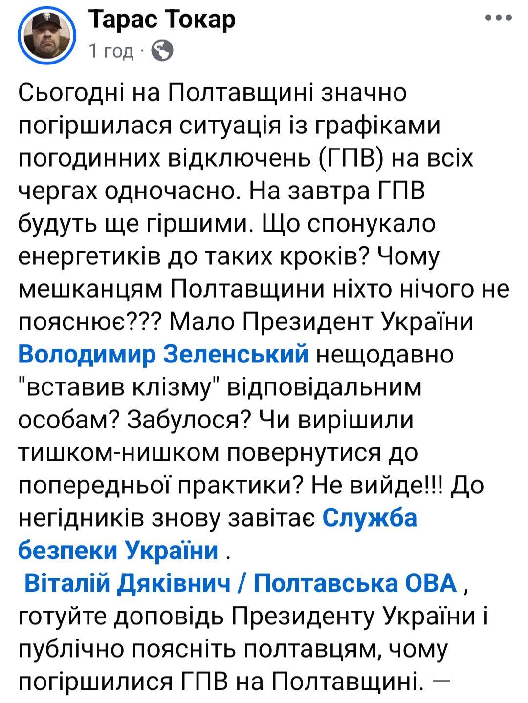 Учора на своїй сторінці у Facebook я знову висловив своє обурення щодо погіршення ситуації із графіками погодинних відключень (ГПВ) на всіх чергах одночасно в Полтавській області.