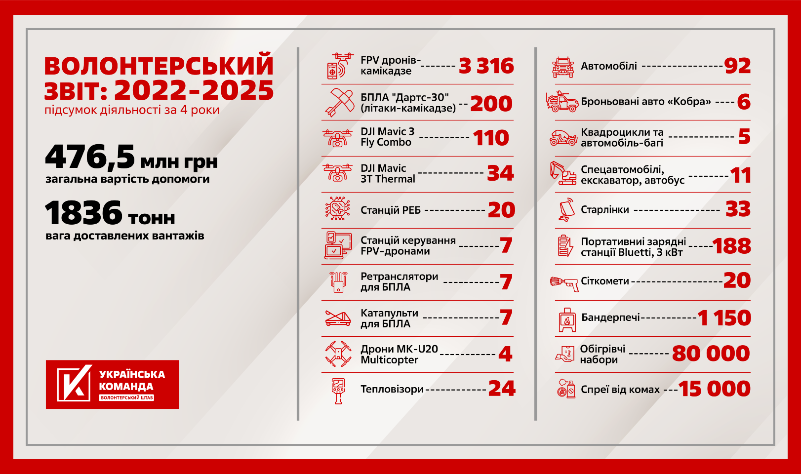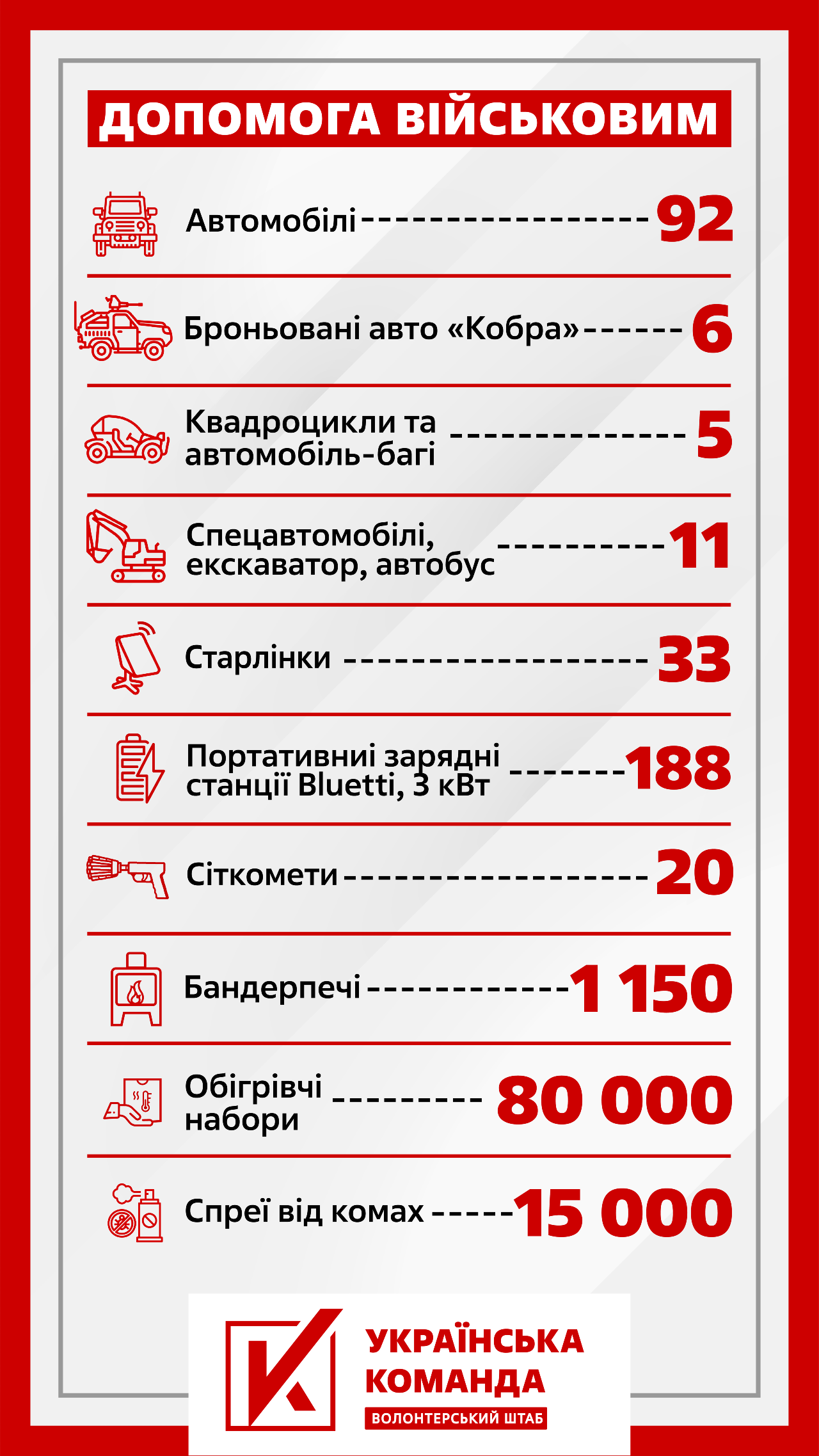 Завдяки вашим донатам та допомозі благодійників «Українська команда» відправила до бойових підрозділів:
