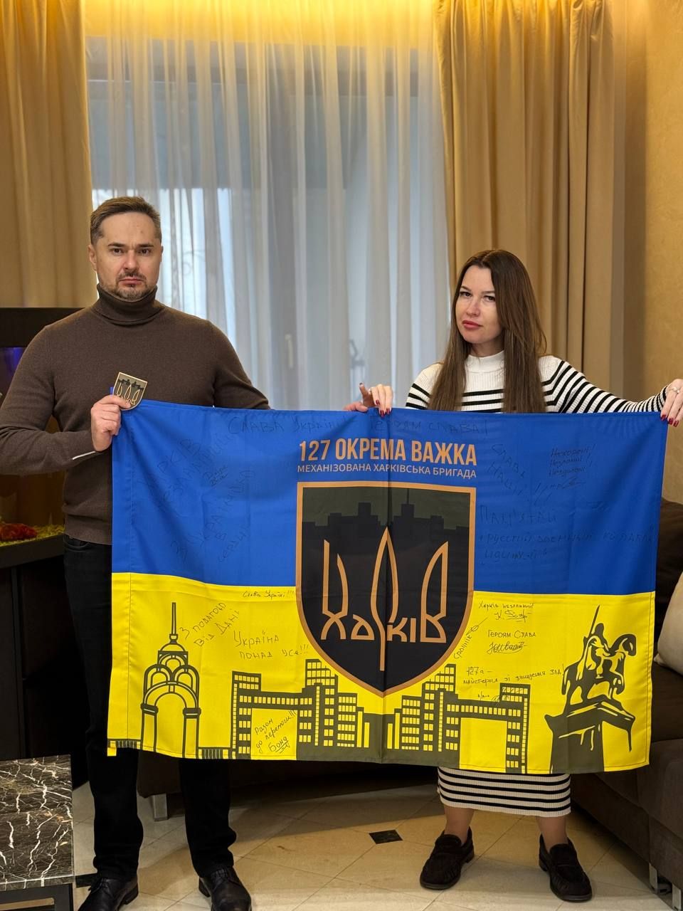 На знак подяки за постійну підтримку українських військових захисники передали волонтерам підписаний бойовий прапор бригади.