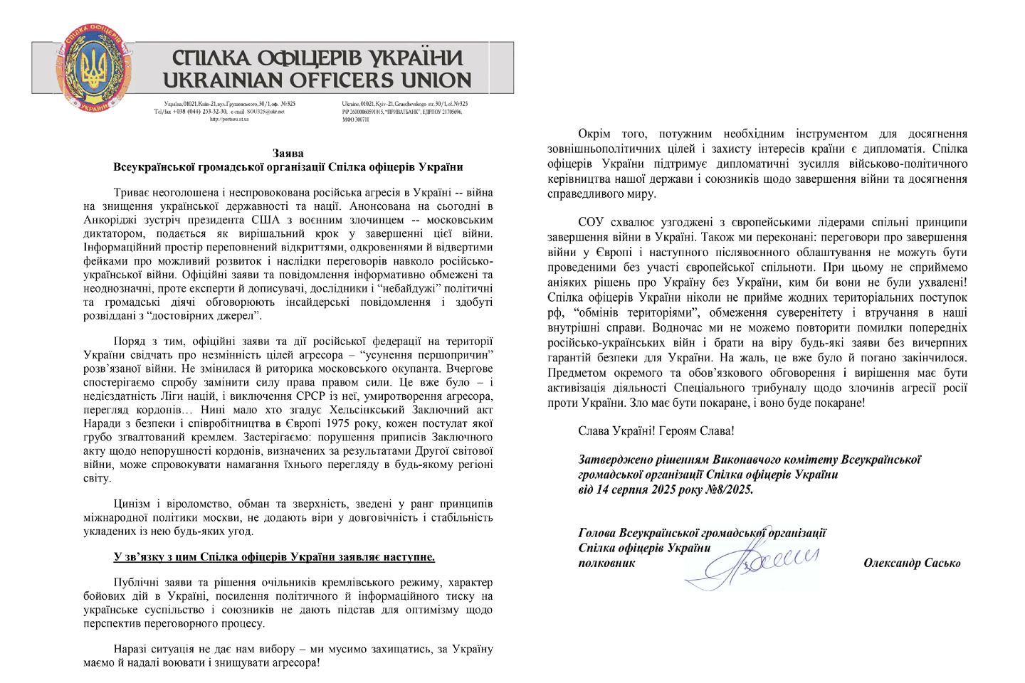 СОУ схвалює узгоджені з європейськими лідерами спільні принципи завершення війни в Україні. Також ми переконані: переговори про завершення війни у Європі і наступного післявоєнного облаштування не можуть бути проведеними без участі європейської спільноти. При цьому не сприймемо аніяких рішень про Україну без України, ким би вони не були ухвалені!