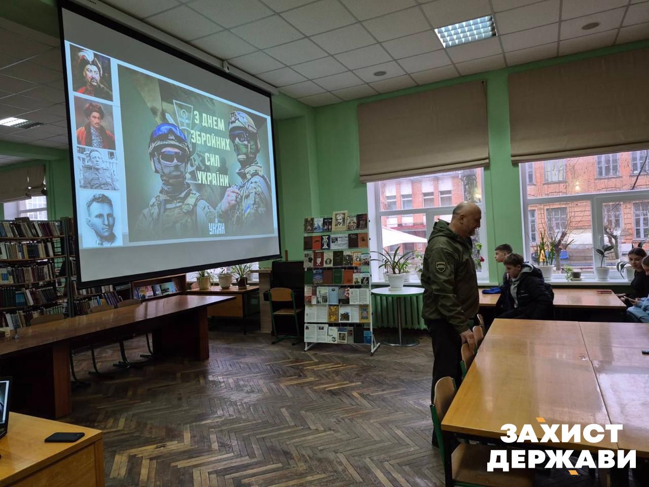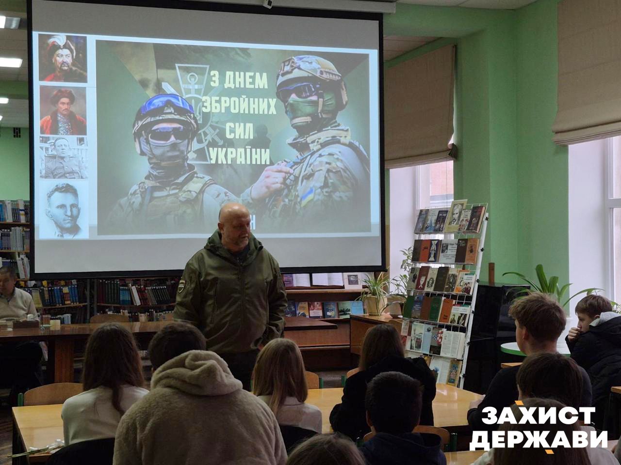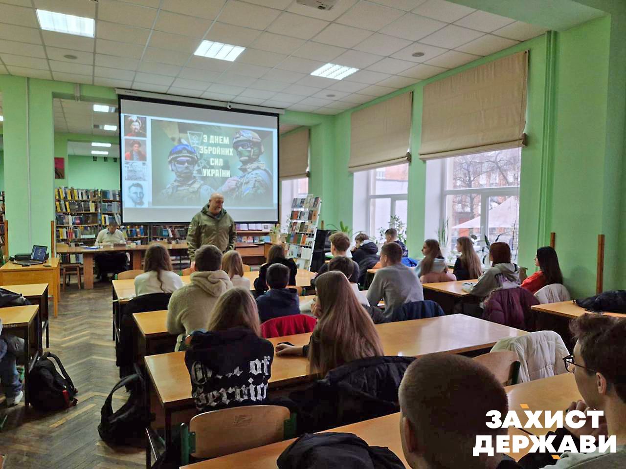 Його розповідь про вибір, про реальну ціну війни, про дух побратимства, про біль втрат і радість зустрічей, про те, що допомагає триматися людям, які йдуть захищати країну, викликала жвавий інтерес. Учні ставили запитання, лекція переходила в живе спілкування.